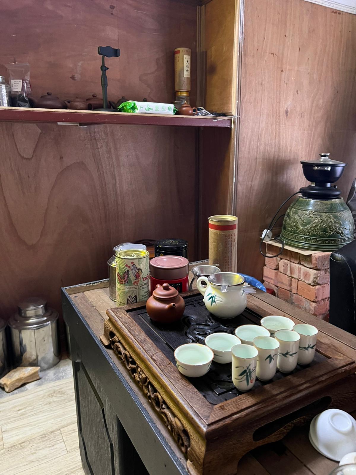 We laten een stukje hout branden in een speciaal bakje – geen idee hoe het heet, maar het ruikt magisch. Terwijl de geur zich verspreidt, mediteren we kort en bereiden we ons voor op de hoofdact: de thee.